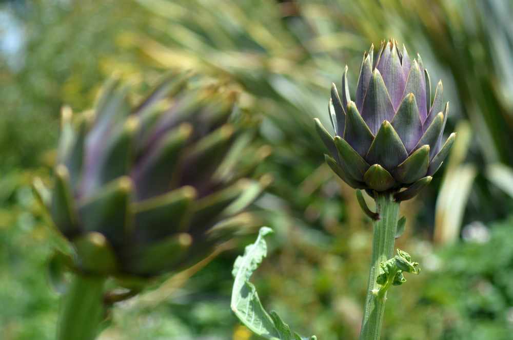 Harvest when the flower buds are still tight and firm, and have grown to a size of 3 inches or more. Fully open buds are inedible but are beautiful to look at. Cut the stems under the bud about 2 – 3 inches down, to create a handle for the artichoke. Once all buds on a stem have been removed, cut the stem down to ground level. If you are harvesting in early summer, and your plant is strong and healthy, you can cut all your stems without buds down by a third, and you may get another harvest in fall. Artichokes taste best fresh from the garden, but can be stored in the refrigerator for a week or two, or pickled and canned for longer storage.
