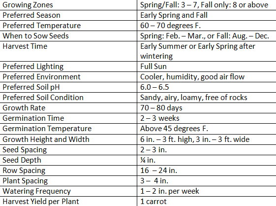 Sow seeds directly into their permanent location as they prefer not to be transplanted. Choose soil that is loamy and light, free of any rocks or debris that might misshape your carrots. This layer of soil should be about 12 inches deep. You can choose to use containers, raised beds, or an in ground garden design, depending on the number of carrots you would like to plant. Once your seedlings are 1 – 6 inches in size, move them 3 – 4 inches apart to give them room. Never let the soil get too hard or compact, and always try and keep it moist. After 5 – 6 weeks of growing, fertilize with potassium and phosphate. Water regularly and more often when plants are developing the roots and carrots.