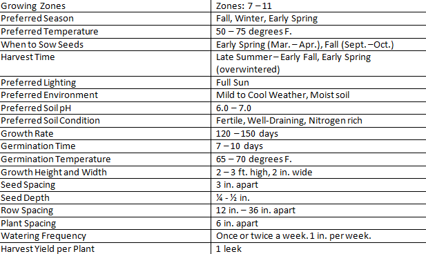 Leeks are similar to green onions and shallots but with a milder sweeter flavor. They are often used in casseroles, soups, stews, stir-fry, or as a simple garnish. Wild leeks, native in North America, are called Ramps, and have a stronger garlic flavor. Leeks are high in a variety of vitamins and minerals that are excellent for health, such as, iron, manganese, and fiber. Leeks require a long growing season so start from seed early. They are biennials but are often grown as annuals depending on location.
