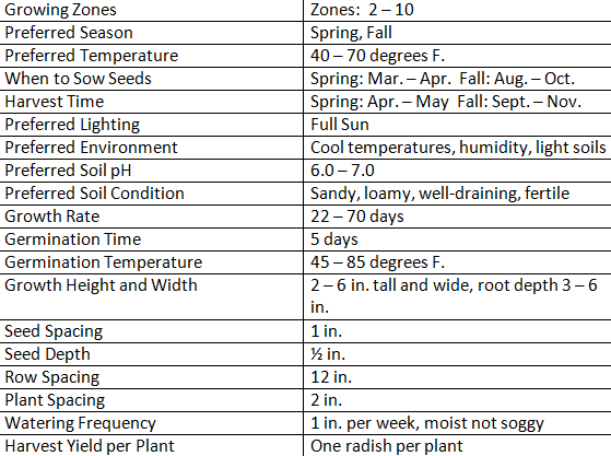 Radishes are very fast growers and are usually ready for harvesting within three weeks to a month under the right conditions. When roots are a good inch in size, they are ready. Once mature harvest radishes immediately to avoid deterioration.  Pull the radishes out gently and rinse the tops and roots off, drying thoroughly.  Cut the radish greens off leaving about an inch of growth and cut the roots tail off. Wash thoroughly again and refrigerate. Store the radish greens in a separate air tight container with a damp wet paper towel.