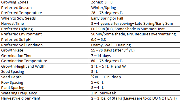 Rhubarb is a perennial vegetable that needs a period of winter dormancy to thrive. When planted from seed it takes 3 years to fully mature for harvest. Only the stems of the plant are edible. The large heart shaped leaves are toxic so be careful not to ingest them. Rhubarb prefers mild temperatures in the summer and colder winters, so it grows better in northern locations. Rhubarb is a lovely visual addition to the garden because it is a beautiful plant with large, vibrant, red, and dark green leaves. Rhubarb stalks are used in cooking to make pies, cakes, jams, jellies, sauces. Rhubarb provides lots of nutrients, such as, vitamin A, C, K, Folate, and Manganese.